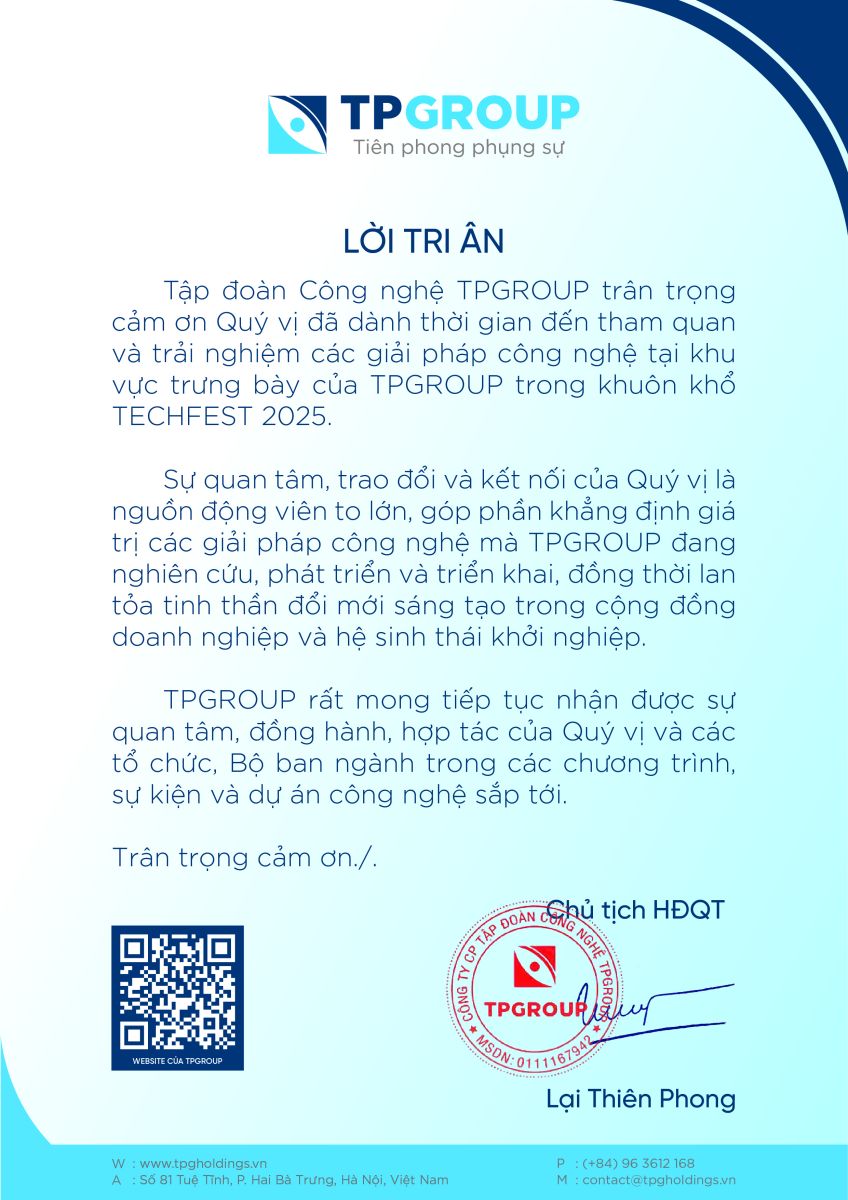 TPGROUP trân trọng cảm ơn Ban Tổ chức TECHFEST 2025, các đối tác, doanh nghiệp và Quý khách đã quan tâm, ghé thăm và đồng hành cùng gian hàng tại sự kiện.